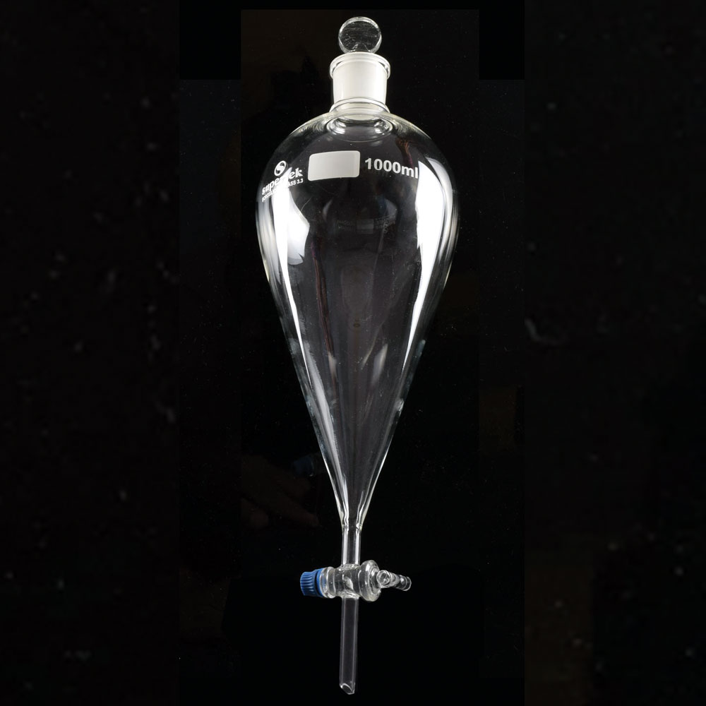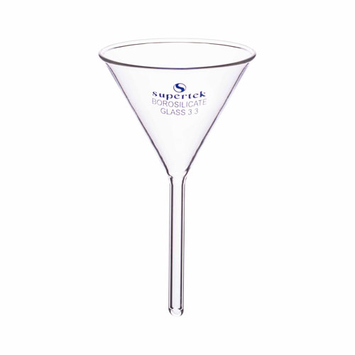 Glass filter funnel with short stem, the body of the funnel is 60° angle. Made of Borosilicate glass. General use for filtering and decanting liquids of varied densities.